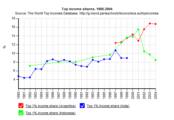 The proposal would work wonders for poverty reduction. Income inequality inside countries is often hidden, as outside commentators fixate on global trends. In Argentina, India and Indonesia, for example, the top 1% experienced a boom in their income shares from 1980 onwards. Whilst the data are incomplete, the following graph shows a gradual upward trend for India from 1980 to 1999, and a similar expansion in Indonesia until 2001 (although in the years following the crisis the income share of the top 1% plummeted back to levels of a decade earlier). In India the trend is even more stark: by 2004 the top 1% took home over 16% of the country’s income, compared with just over 12% seven years earlier. These are countries in which poverty remains widespread.