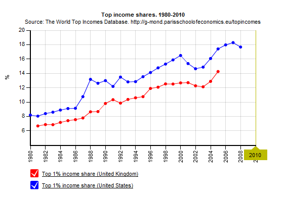 A minimum wage related to the median wage would tackle the increase in inequality seen in developed countries during the last few decades. In the UK real wages stagnated. Earnings for the top 10% doubled over the last 30 years, while those at the bottom were only 27% better off. The share of the top 1% of income earners in the US and UK soared, as shown here: