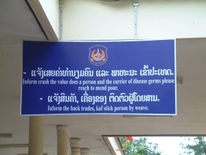 I’m not normally critical of badly-written English abroad — why should people write perfectly in an alien tongue? But this sign, from a visit this morning to the border post at Vangtao on the border between Laos and Thailand, really beats them all. My colleague says the Lao translates as something to do with presenting yourself at quarantine if you feel ill. Obviously it doesn’t apply to English speakers.