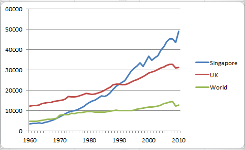 Just to reinforce how quickly the Singaporean economy has grown, here’s a graph showing GDP per capita since independence in US dollars taking into account inflation and the cost of living. According to these figures Singapore started out as poorer than the world average and overtook Britain in about 1990. The Asian crisis in the late 1990s had a temporary impact, as did the 2008 global financial crisis, but immediately after both these dips the economy resumed its onward march. The steepest part of the whole graph, incredibly, looks like it’s been in the past few years. It’s as if the economy immediately makes up lost ground after each downturn.