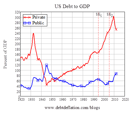 Yup, the UK deficit, like many others, is certainly pretty awful and needs to be sorted out — i’m sure Keen would acknowledge this. The only choice is between cut now or cut later. But that debate’s been played out a thousand times elsewhere and it’s not really the focus of the current discussion. What is true is that most of the media fail to distinguish between private debt — which is much bigger and has grown faster — and public debt, which is still very high but not as high as private. There also isn’t much discussion of the way in which some private debt has been socialised, and the links between the two.