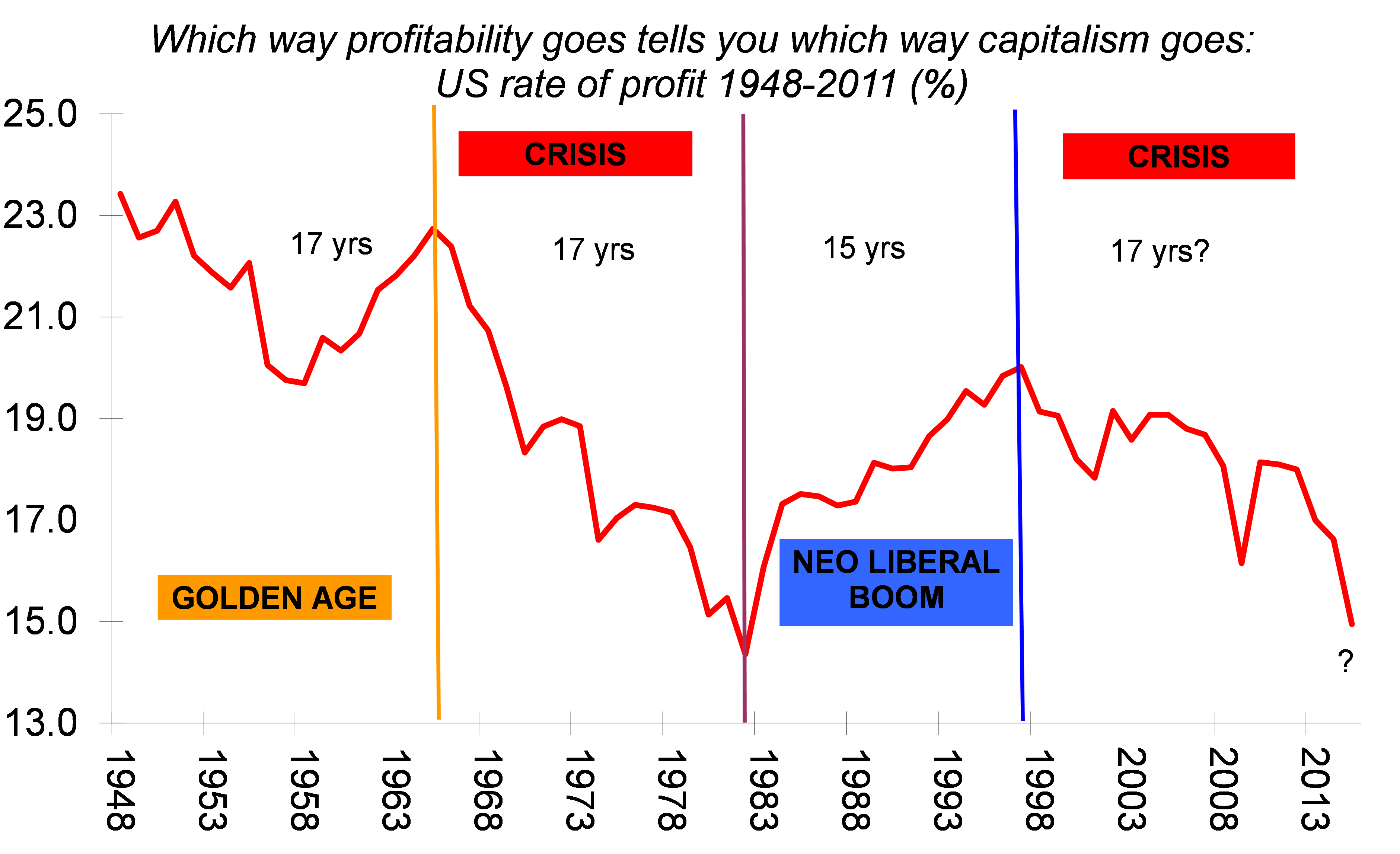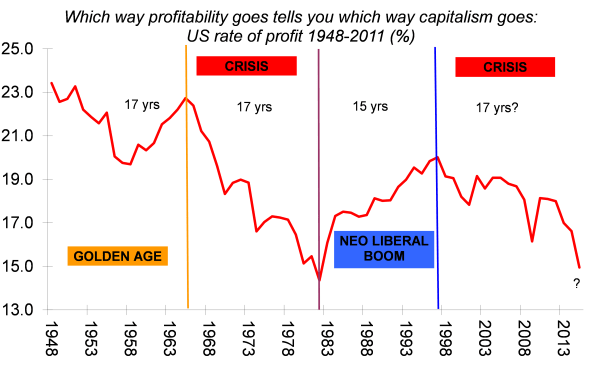 Capitalists try to top up their profits with new technologies, by exploiting workers more, and by gambling in new and more exotic forms of finance. The latter became particularly pronounced in the later years of the most recent crisis. Eventually, though, capitalists can’t buck the decline in the rate of profit. There are different ways of calculating profits but the following graph from Roberts shows that the rate of profit in the United States is running at one of its lowest points in the last 65 years, which is perhaps surprising given the story of relentless efficiency peddled in the media.