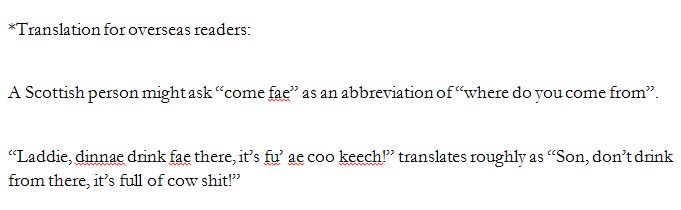 A visitor to Scotland was walking through a farmer’s field one day when he spotted a pool of water. He was thirsty and began to drink from it, scooping the water out with his hand. When the farmer saw what he was doing he cried, “Laddie, dinnae drink fae there, it’s fu’ ae coo keech!”*