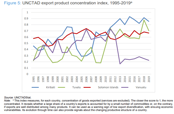 In the Pacific, trade hasn’t grown much relative to the size of the economy. Exports in three of the four regional LDCs have become less diversified since 1995.